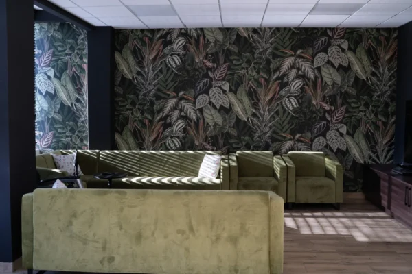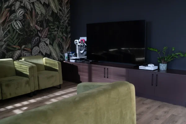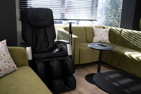 Strefa relaksu z konsolą, tenisem stołowym i fotelem masującym